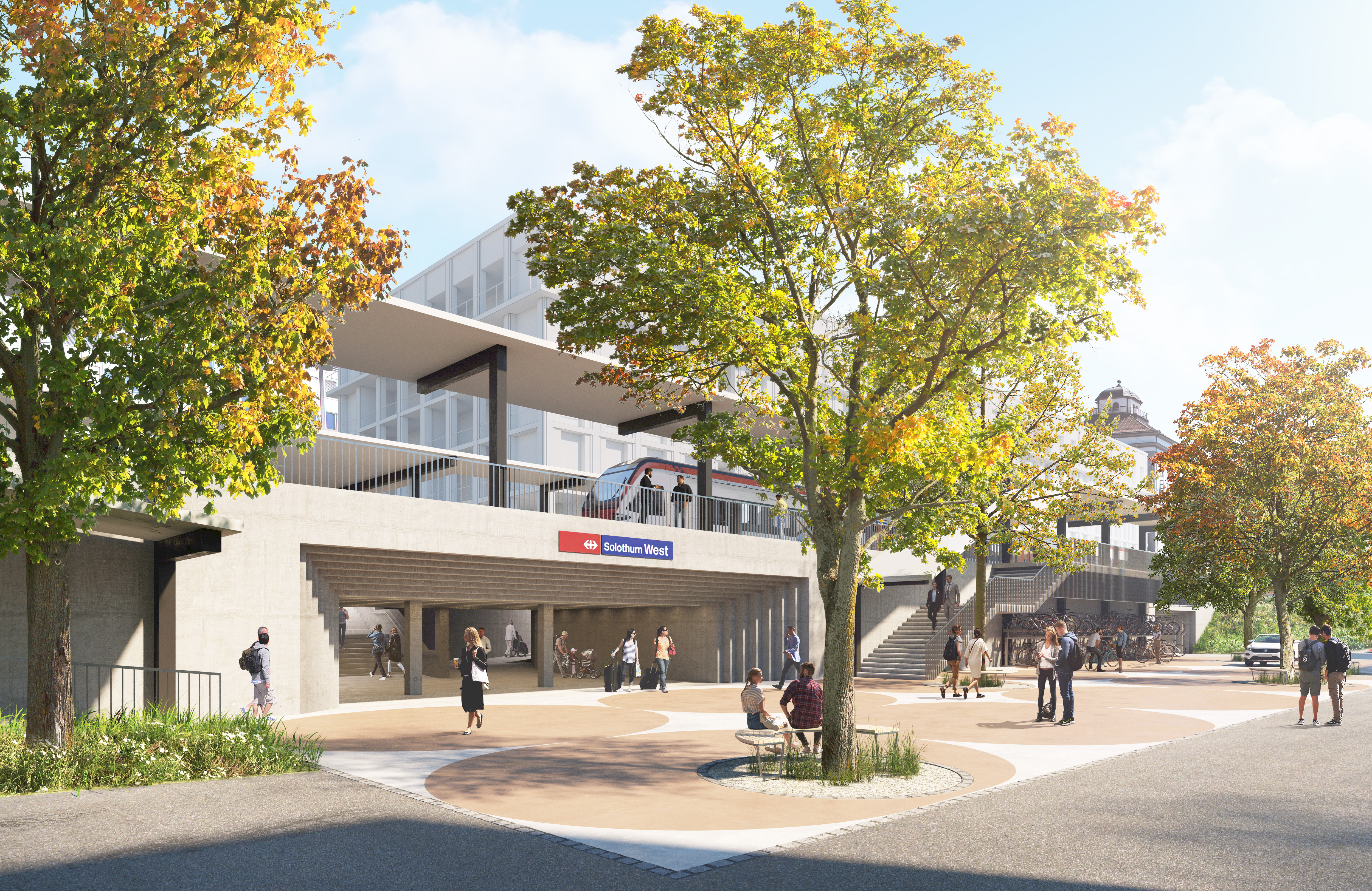 Bauarbeiten BahnhofUmbau Perrons und Verbreiterung Personenunterführung Der Westbahnhof wird barrierefrei, moderner und besser erschlossen. Die SBB erhöht und verlängert die Perrons, verbessert die Kundeninformation und die Beleuchtung. Damit erfüllt sie die Anforderungen des Behindertengleichstellungsgesetzes (BehiG) und ermöglicht einen hindernisfreien Zugang zu den Zügen. Gleichzeitig wird im Auftrag der Stadt die bestehende Personenunterführung verbreitert, womit die Anbindung der Weststadt ans Stadtzentrum attraktiver wird. Die Solothurner Stimmbevölkerung hat dem Projekt am 12. März 2023 zugestimmt. Im Rahmen des Agglomerationsprogramms unterstützt auch der Bund das Projekt mit Beiträgen. Neues Parkhaus und mehr Veloabstellplätze Während den Umbauarbeiten an den Perrons und der Personenunterführung beginnt die SBB mit den Vorarbeiten für den Bau des vierten öffentlichen Parkhauses der Stadt. Das doppelstöckige Parkhaus wird später auf Grundlage des Gestaltungsplans «Westbahnhof SBB» durch SBB-Immobilien erstellt. Der Baustart erfolgt frühestens ab 2028. Das Parkhaus soll in das städtische Parkleitsystem eingebunden und durch die Parking AG betrieben werden. Mit mindestens 220 öffentlichen Parkplätzen entlastet es die Innenstadt künftig weiter vom Verkehr. Daneben realisieren die Stadt und die SBB gemeinsam öffentliche, überdachte Veloabstellplätze beim Hauptzugang zum Bahnhof und auf der Seite Dammstrasse. Das grössere Angebot an Veloabstellplätzen und das neue Parkhaus verbessern die Erreichbarkeit und bieten künftig mehr Raum für kombinierte Mobilität. Die Bauarbeiten dauern von Dezember 2025 bis voraussichtlich Ende 2027. Einschränkungen während der Bauzeit