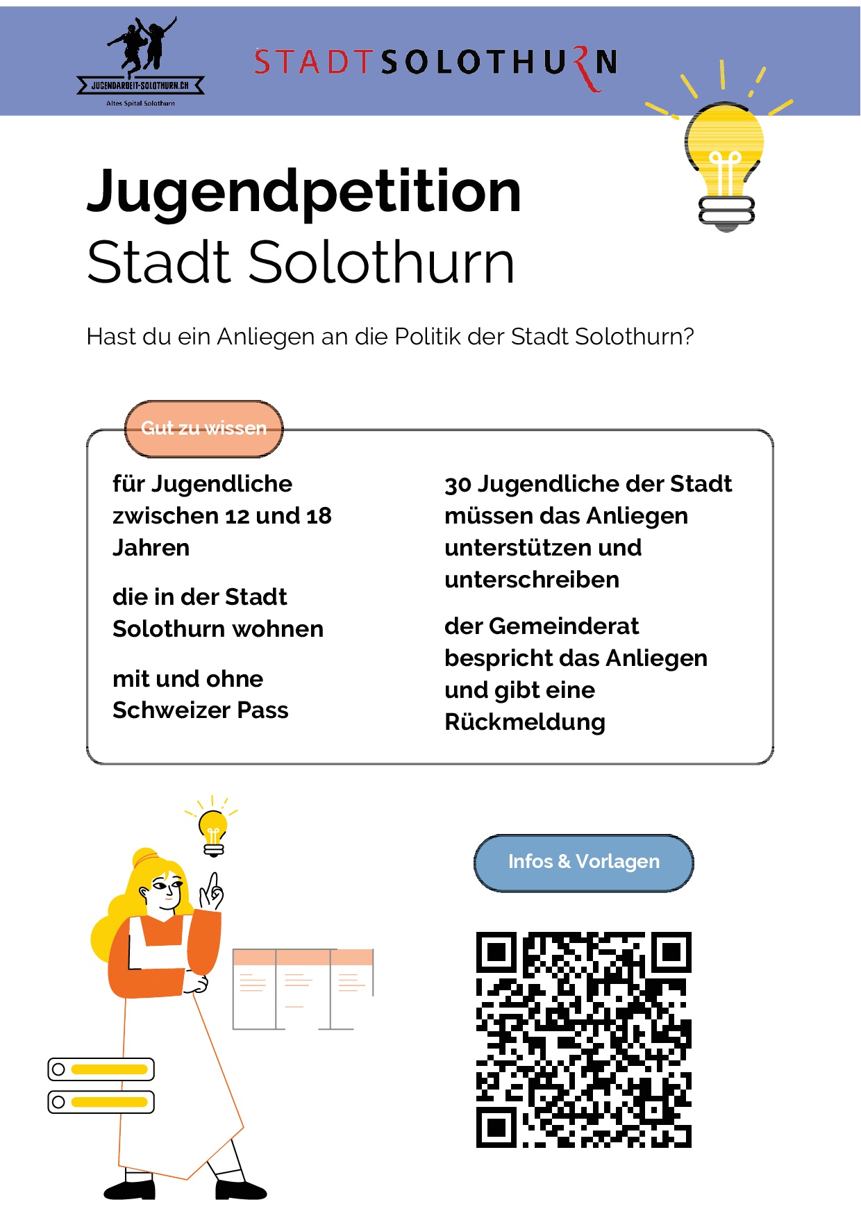 - Eine Jugendpetition kommt zustande, sofern sie von mindestens 30 Jugendlichen zwischen 12 und 18 Jahren mit Wohnsitz in der Stadt Solothurn unterzeichnet ist.